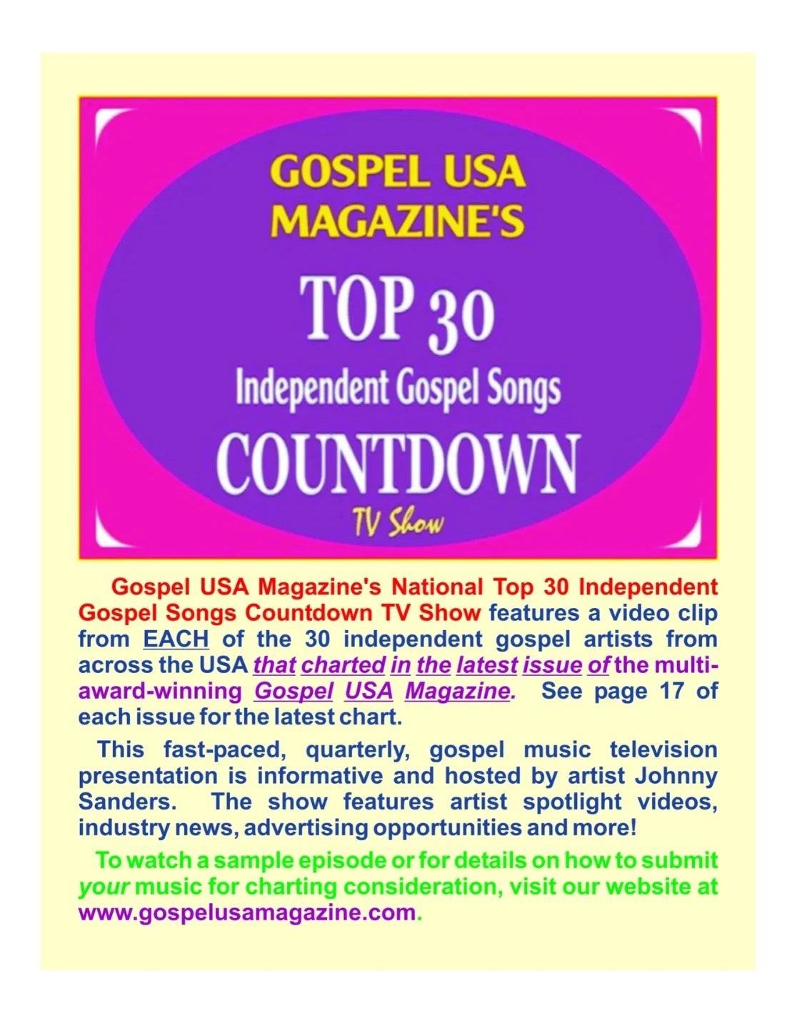 Gospel USA Magazine is a nationally-distributed, quarterly, Gospel music & news magazine, currently in its 26th year of publication. We are America's LONGEST-RUNNING, nationally-distributed, physical and digital, Black Gospel music publication. Our physical version is available NATIONWIDE by postal mail subscription sent to dedicated s