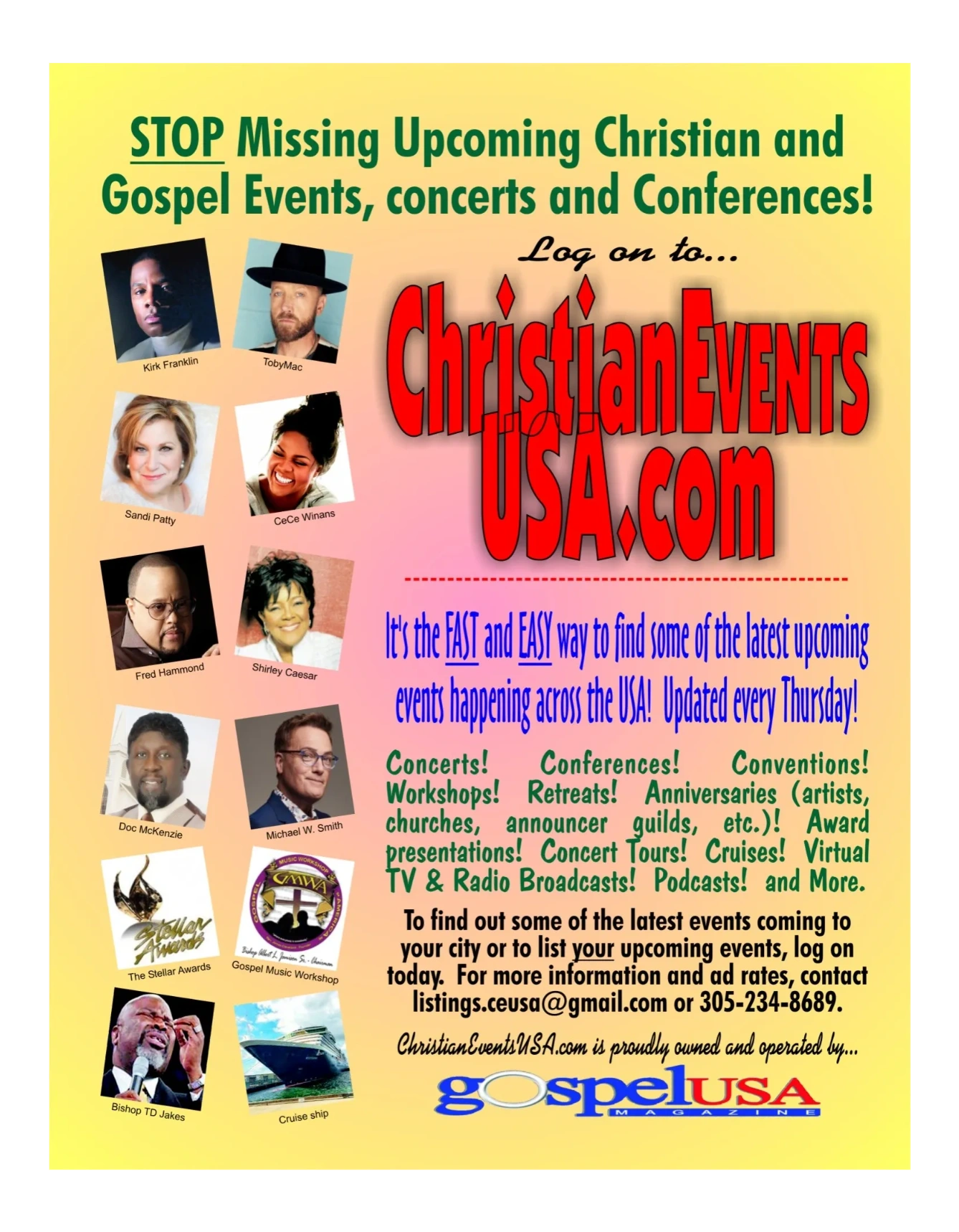 For Contemporary Christian, Traditional Gospel, Quartets, Choirs, Rap, R & P and more -- Christian Events USA is the FAST and EASY way to find out some of the latest upcoming events happening across the USA. Click on the button below to visit the website.